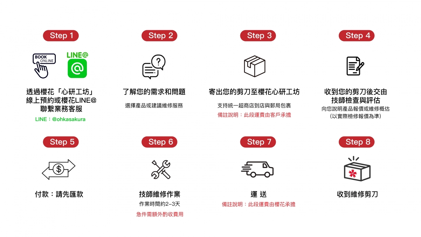 如有任何剪刀維修、保養或產品相關問題,歡迎透過電話、官方LINE或網站留言與我們聯繫。我們將有專人即時回覆,提供最專業的協助與建議。您的需求與意見,是我們持續精進的動力。